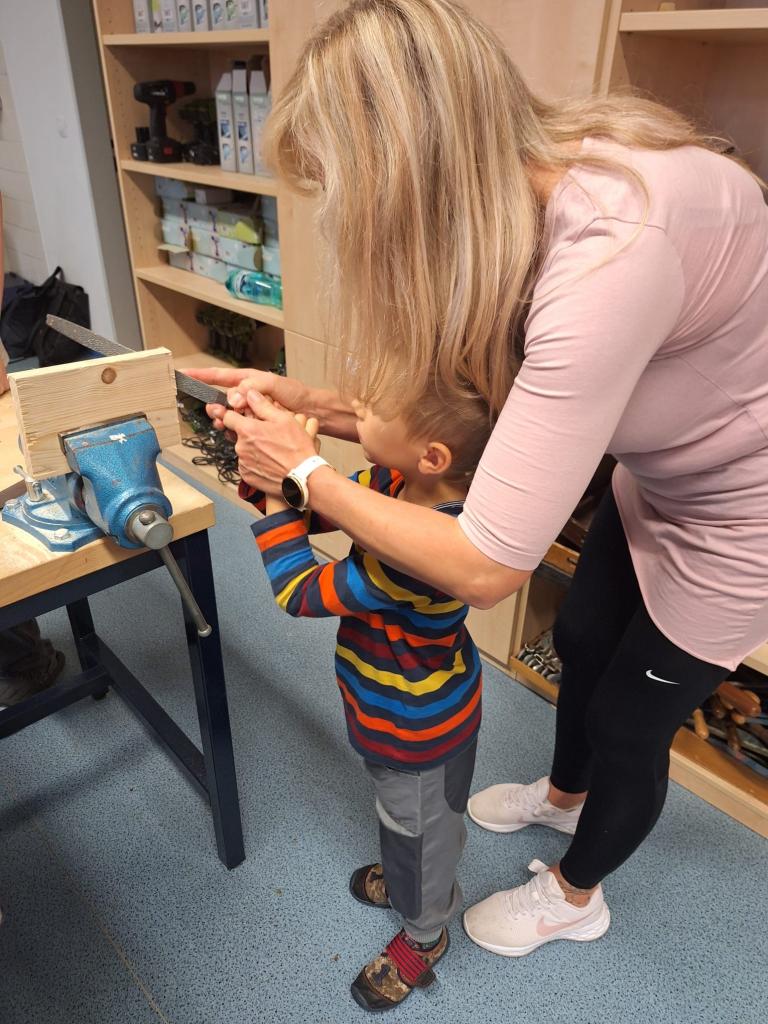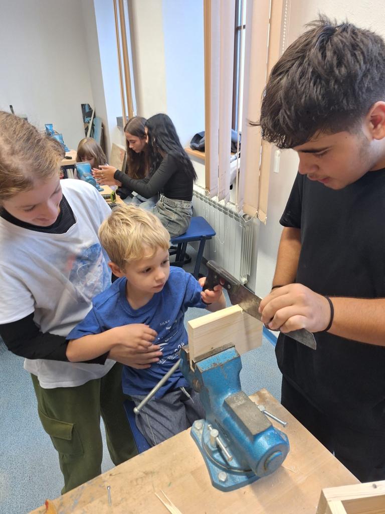 Nebudu vám lhát, v dílnách to bylo jak na nějaké megastavbě. Velcí si do svých skupinek vzali skupinky těch menších a chopili se práce. Ozývalo se vrtání, pilování, řezání, rány kladivem, prostě čilý ruch. A nemyslete si, že nástroje používali jen deváťáci. Naopak! Bylo velkým překvapením, jak některé děti ovládají nejen pilníky a pilky, ale dokonce vrtačky i zmíněná kladiva. Když byly domky hotové, začaly se plnit. To zas pod dozorem paní učitelky Škulinové a Brabcové, které s nápadem přišly.