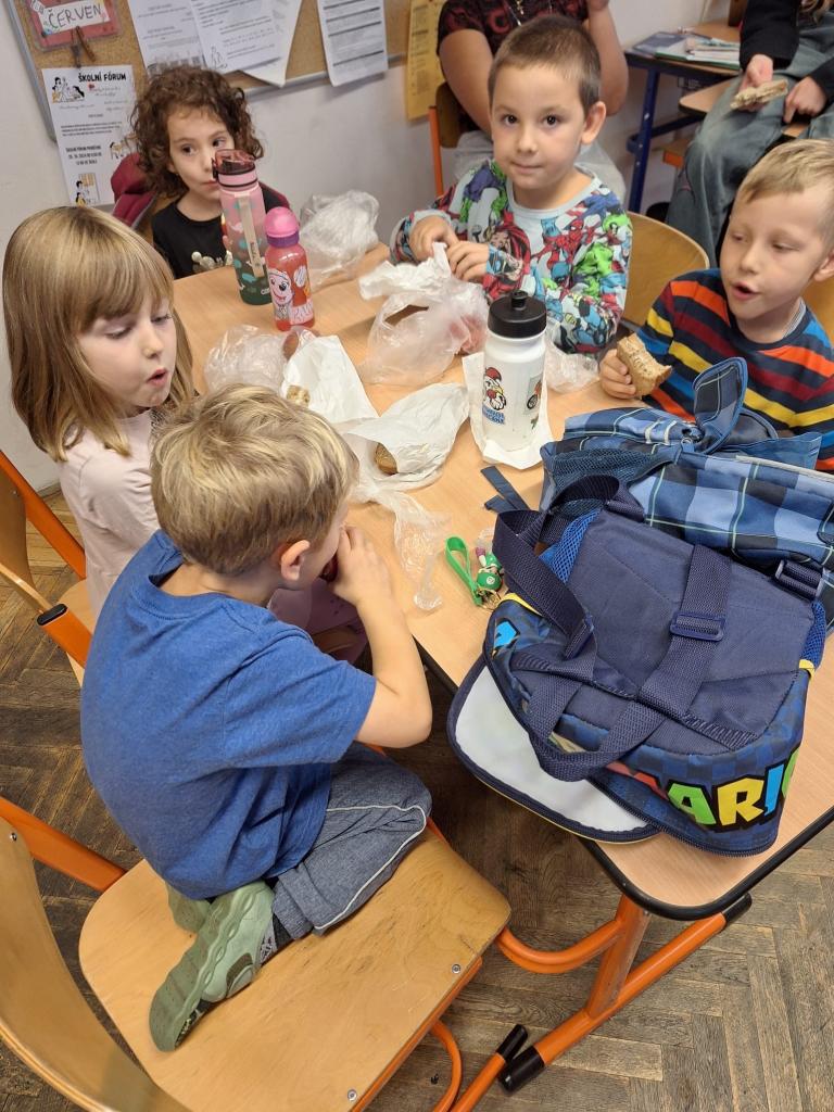 Jako překvapení pro menší kamarády jsme si připravili svačinovou přestávku přímo v naší kmenové třídě. Takže si děti nejen mohly prohlédnout, jak to u takových deváťáků vypadá, ale zažily i „vzrůšo“ velké přestávky.
